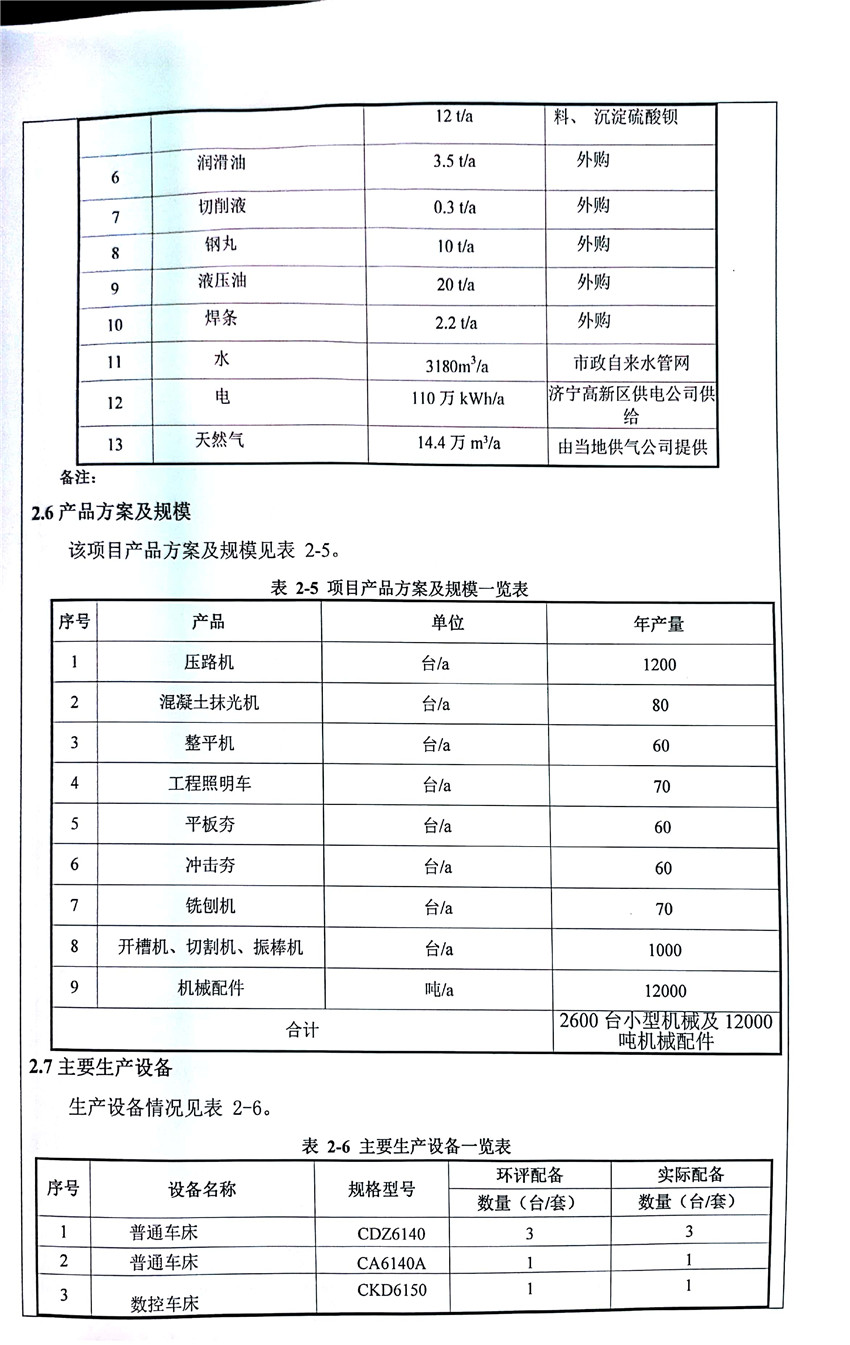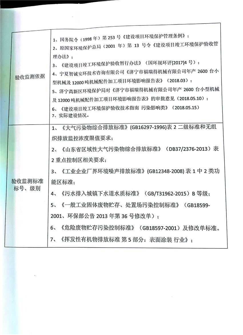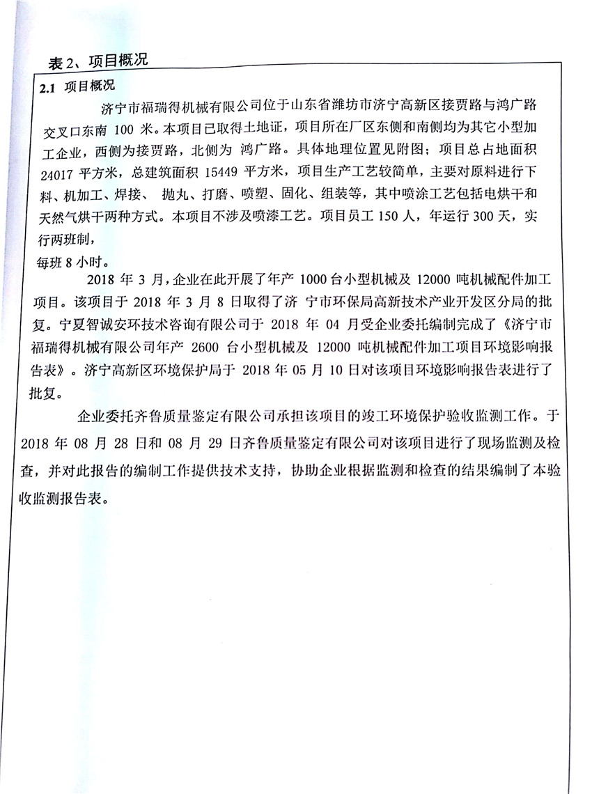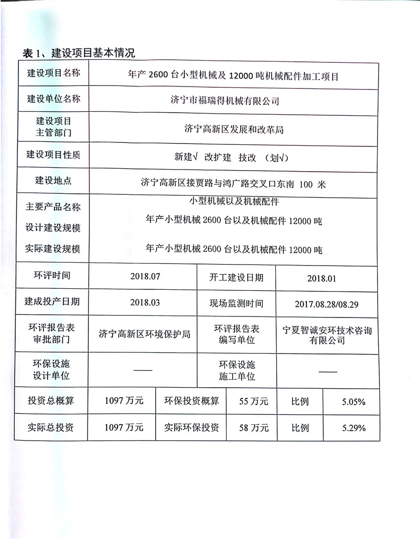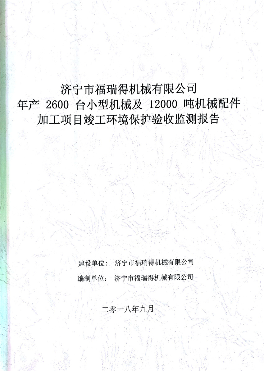 濟寧市福瑞得機械有限公司年產(chǎn)2600臺小型機械及12000噸機械配件加工項目(廢氣、廢水)竣